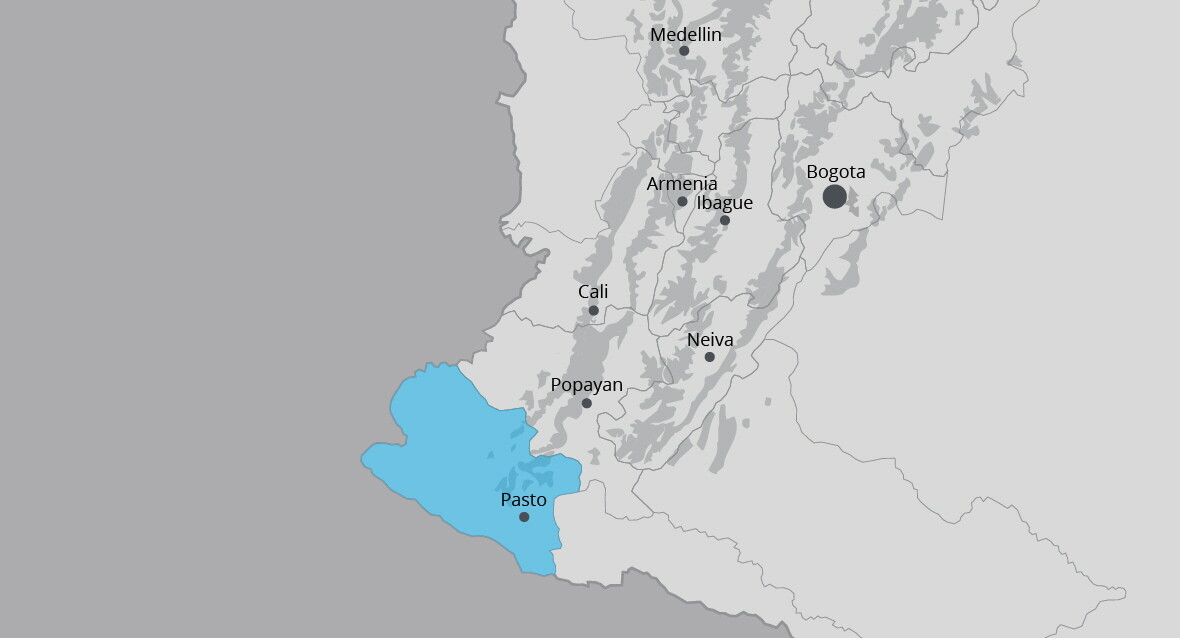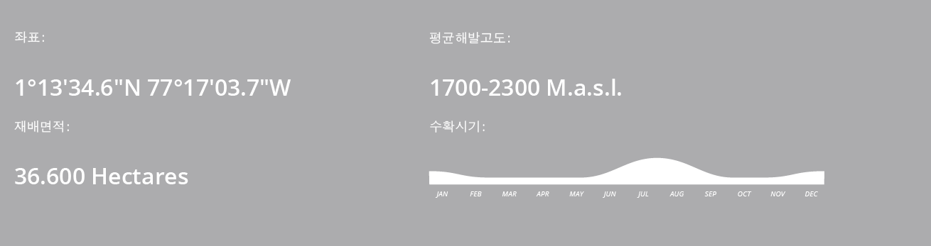 콜롬비아 최남단, 적도권에 위치한 나리뇨에는 높고 가파른 산맥을 따라 7개 이상의 화산이 솟아 있습니다. 그 주변으로는 최고 해발고도 2,300m까지 달하는 높은 지대에 커피 농장들이 자리잡고 있습니다.